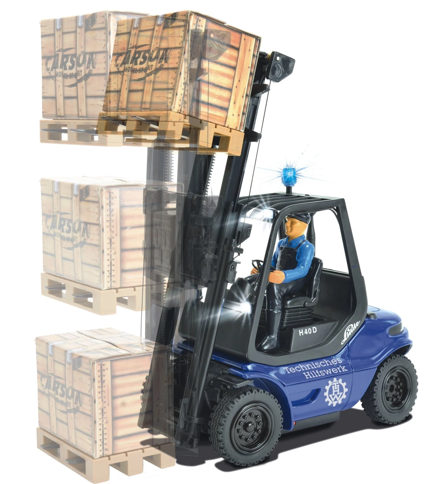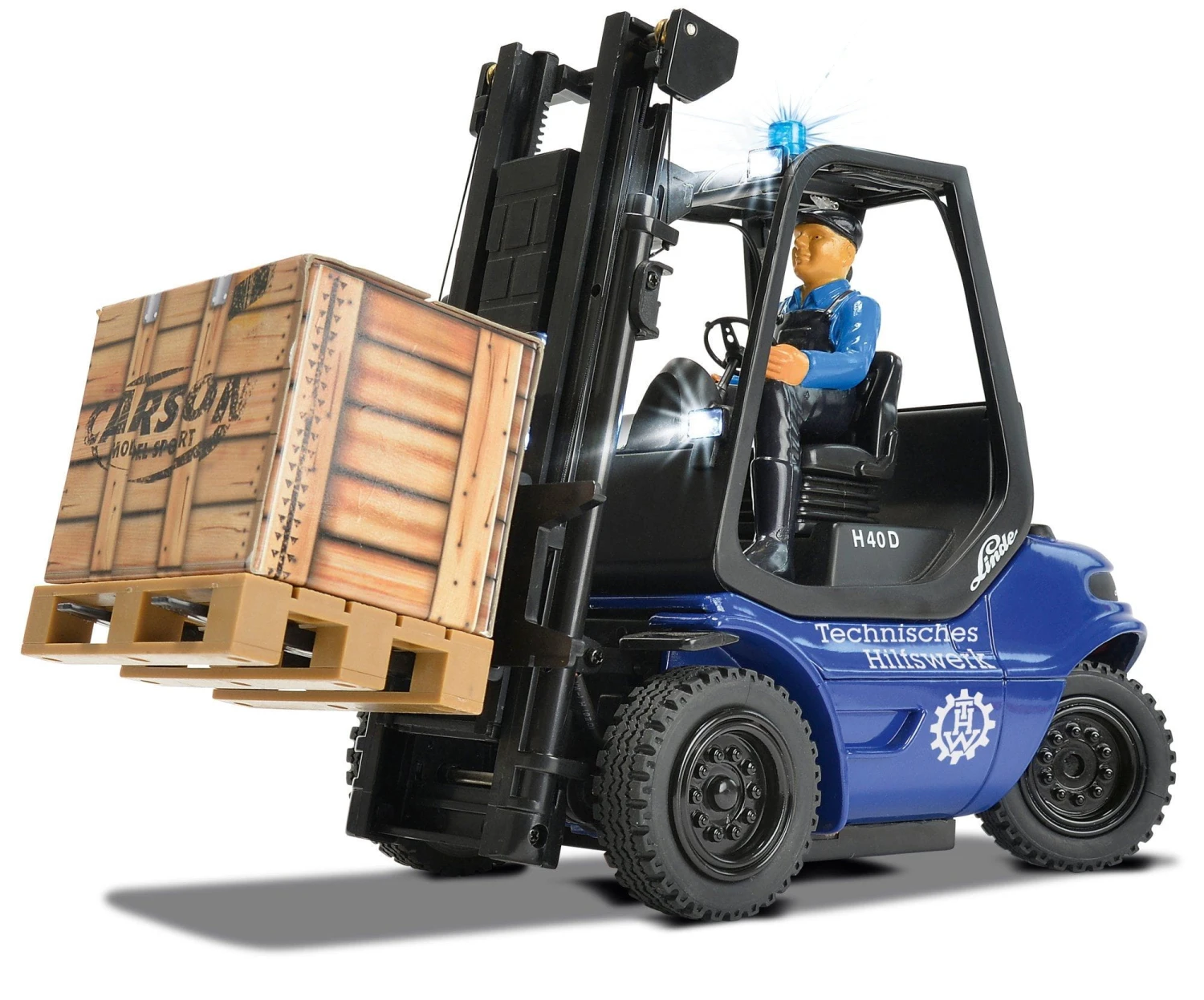 Der CARSON-MODEL SPORT THW Gabelstapler Linde H 40 D im Design des Technischen Hilfswerks ist ein voll funktionsfähiges RC-Modell, das jeden Truck-Fuhrpark perfekt ergänzt. Ferngesteuert wird der Miniaturstapler per 6-Kanal 2,4 GHz Pultsender. Neben den vielen Fahrfunktionen verfügt das Fertigmodell über einen funktionstüchtigen Gabelbaum sowie ein Licht- und Soundmodul. Gelenkt wird vorbildgetreu über die Hinterachse, dies sorgt für das typische Fahrbild. Lasten bis 200 g heben, transportieren und verladen, all das erledigt der quirlige Lastenträger mit Hilfe kleiner Elektromotoren. Zusätzlich werden alle Tätigkeiten mit kleinen LEDs und einem Minilautsprecher perfekt begleitet. Rückfahrscheinwerfer, Rundumleuchte und Warnpieper sichern den Betrieb ab. Zur umfangreichen Serienausstattung des fertig aufgebauten CARSON THW Gabelstaplers samt Fahrerfigur gehören neben der Fernsteuerung mit Tragegurt eine Palette, Ladegut sowie alle benötigten Fahr-/Senderbatterien.