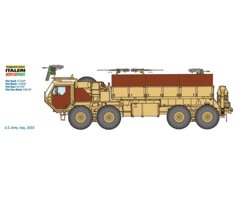The acronym HEMTT (Heavy Expanded Mobility Tactical Truck) identifies a range eight-wheel drive off-road capable heavy truck, produced from the mid-80s for the United States Army. Thanks to its features, the HEMTT is able to guarantee a great off-road mobility and significant transportation performance. It has become the real „workhorse“ of the Army capable of carrying ammunition and equipment in a very effective way. In a lot of conflicts, as in Iraq and Afghanistan, it has been often modified by the field workshops, on the specific requirements of the crews, in order to be more and more effective in the hard operating environments, Furthermore some HEMTT versions have been modified to be used in escort and convoys protection duties. Some additional protections and defensive weapons have been add on.