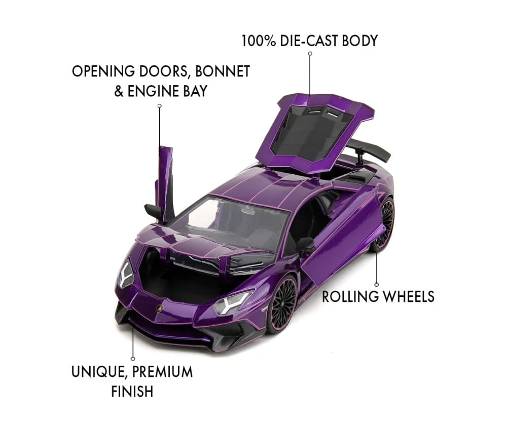 Präzise und detailliert fängt das Miniatur-Auto den Charakter des luxuriösen Supersportwagens ein und bildet ihn originalgetreu im Maßstab 1:24 ab: seine aerodynamische Bauweise und die markante Lackierung mit Lila- und Schwarz-Tönen ebenso wie seine luxuriöse Innenausstattung. Öffne die Motorhaube, den Kofferraum und die Flügeltüren, um dich vom beeindruckenden Innenleben des Modellautos zu überzeugen!