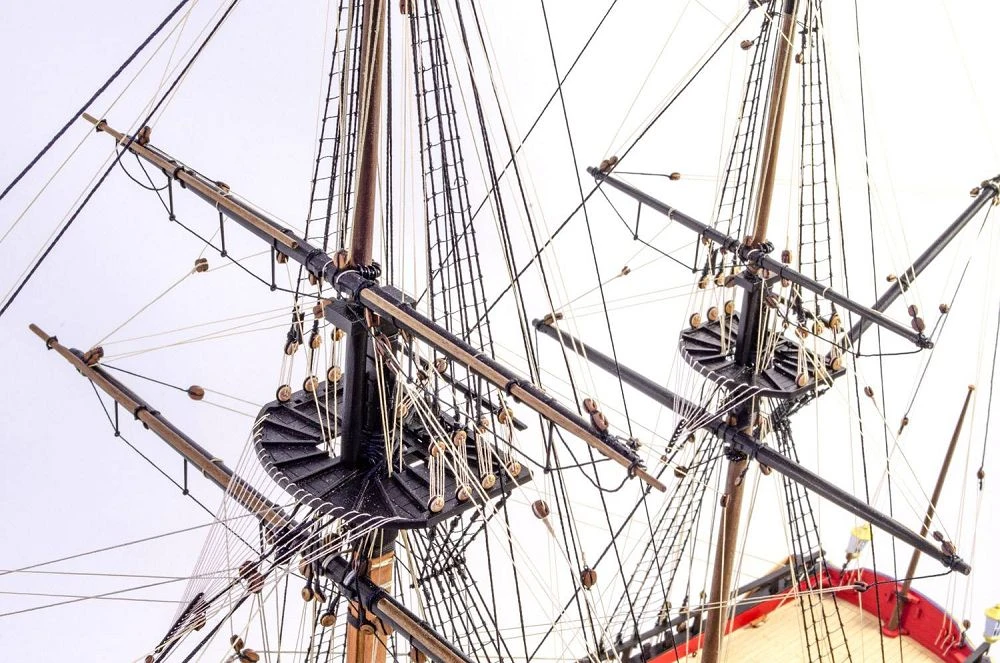 – Mehrere Größen von schwarzem und natürlichem Takelgarn sowie alle erforderlichen Blöcke und Takelaugen