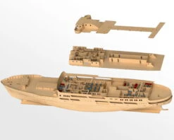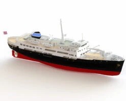 Für die Entwicklung des Bausatzes der M/S Finnmarken konnten Originalzeichnungen der Hamburger Werft Blohm & Voss verwendet werden, von der sie 1956 gebaut und geliefert wurde. Das Modell ist im Maßstab 1:60 korrekt reproduziert. Es hat einen wunderbar schönen Rumpf und kommt mit vollem Dekor! Die Aufbauten können geöffnet werden, um die Einrichtung der Salons zu sehen. Zusätzlich kann das Modell mit LEDs sowohl intern als auch extern beleuchtet werden. Der Bausatz ist für die Verwendung mit Antrieb und Fernbedienung auf dem Wasser konstruiert, begeistert aber ebenso als Standmodell. Das Dekor enthält die Schriftzüge der Schwesterschiffe M/S Finnmarken, M/S Ragnvald Jarl und M/S Sjøkurs mit den NRK-Logos “ Summer Boat“.