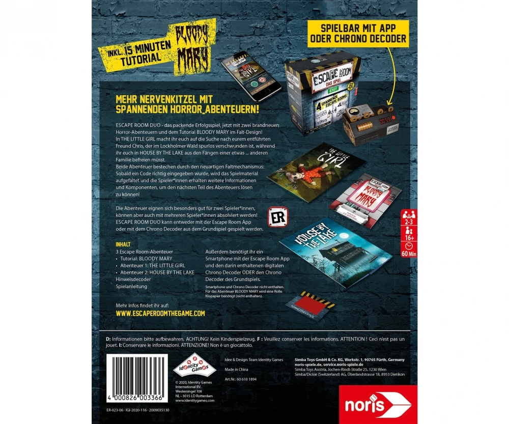 Escape Room Duo – das packende Erfolgsspiel, jetzt mit zwei brandneuen Horror-Abenteuern und dem Tutorial Bloody Mary im Falt-Design! In „House by the Lake“ müsst ihr euch aus den Fängen einer seltsamen Familie befreien, während ihr bei „The Little Girl“ euren entführten Freund in einem Wald sucht. Beide Abenteuer bestechen durch den neuartigen Faltmechanismus: Sobald ein Code richtig eingegeben wurde, wird das Spielmaterial aufgefaltet und die Spieler erhalten weitere Informationen und Komponenten, um den nächsten Teil des Abenteuers lösen zu können!