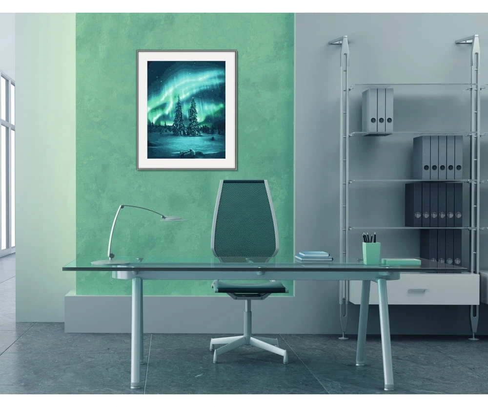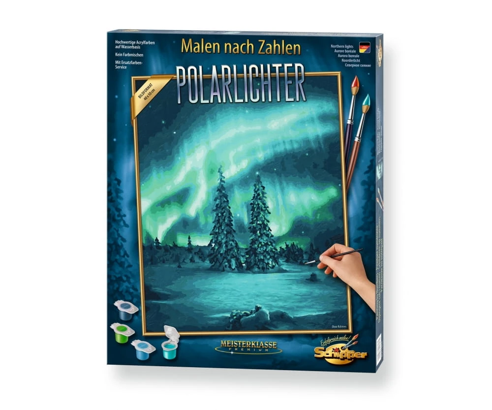 Das Naturphänomen der Polarlichter zieht alle Menschen in ihren Bann. Die spektakulären Lichterscheinungen am Nachthimmel regen zum Träumen an und entführen in eine spannende Fantasie- und Fabelwelt. Die in grünlich-bläuliches Licht eingetauchte Winterlandschaft verstärkt diese Mystik und verleiht dem Bild eine ganz besondere Ausdrucksstärke. Auch der Hobbymaler taucht ein in diese Welt und ist begeistert von den magischen Strahlen des Lichts.