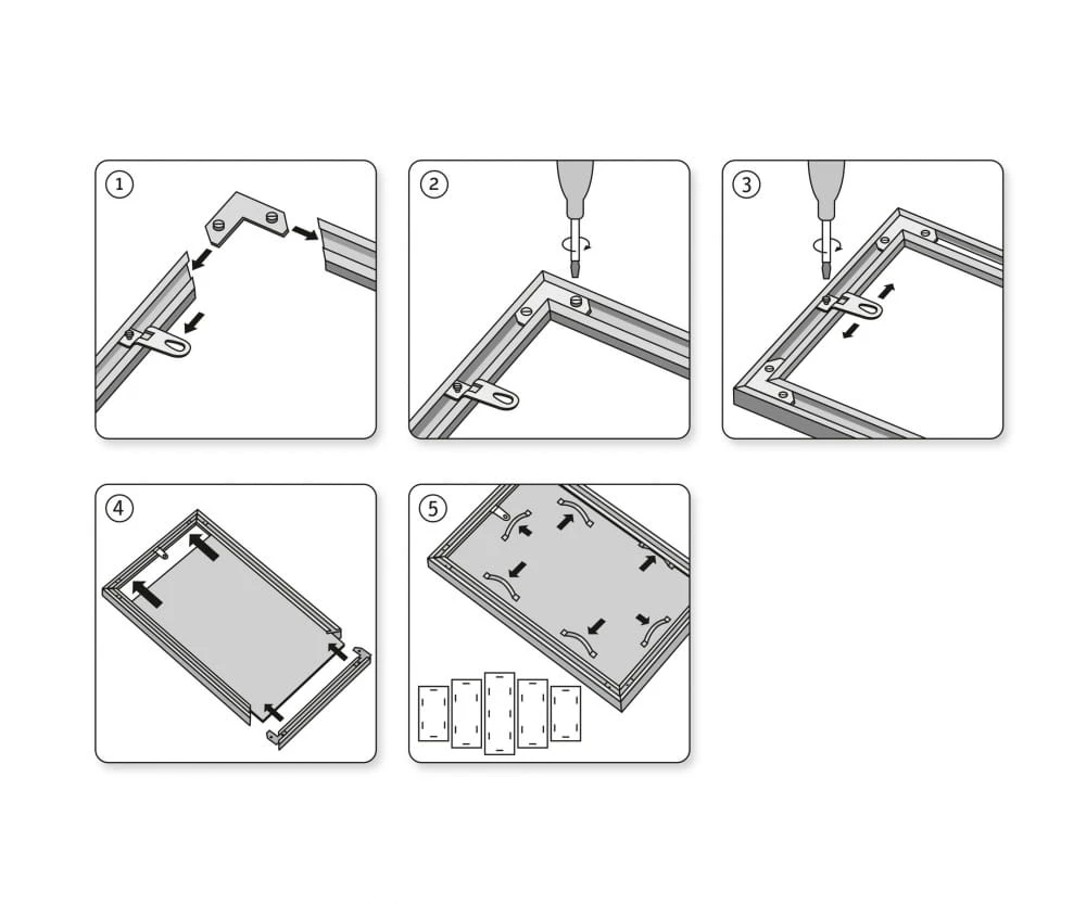 20 silberfarbene Rahmenleisten für 5 Bilderrahmen mit Befestigungsmaterial (Eckverbinder, Federn, Aufhänger und Schrauben), Montageanleitung..