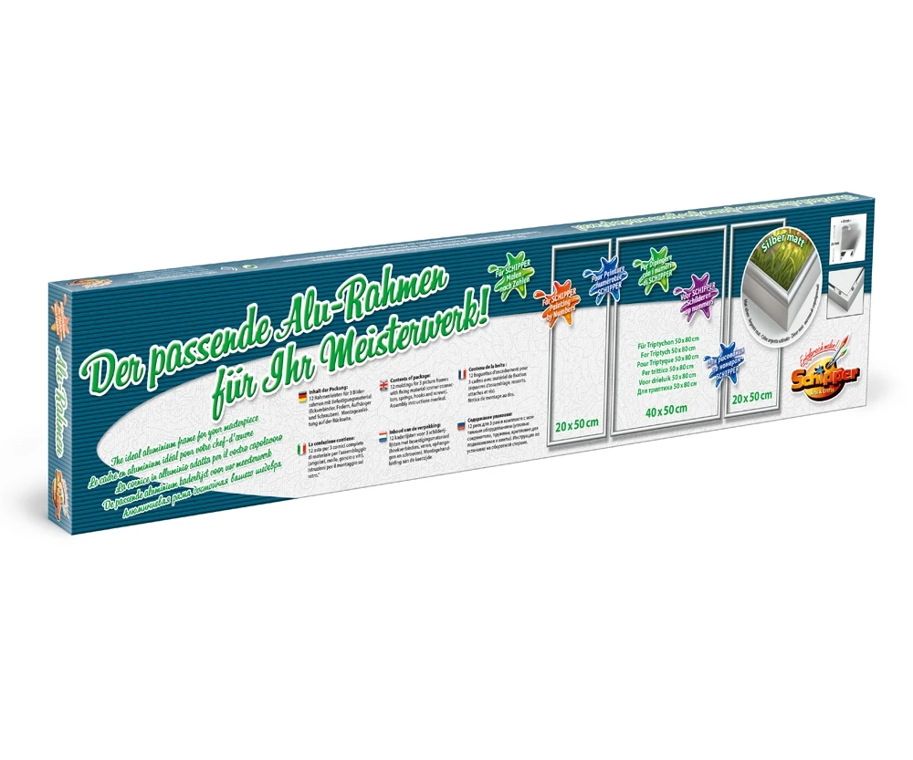 Ogni dipinto raggiunge il massimo della sua bellezza soltanto quando è corredato della cornice appropriata. A fronte del vastissimo assortimento in commercio è molto difficile scegliere la soluzione più confacente. La SCHIPPER Arts & Crafts ha optato per una cornice in alluminio adatta sia a tutti i soggetti della serie „Dipingere con i numeri“, sia a qualsiasi arredamento. Il suo profilo sottile, conferisce al dipinto forza espressiva e lo contorna con sobrietà. Le cornici sono fornite sottoforma di astine singole molto semplici da montare. Ciascuna confezione contiene il materiale necessario per l’assemblaggio e le istruzioni per il montaggio. Le cornici sono disponibili per i formati 24 x 30 cm, 40/50 cm, 50/60 cm, 40/80 cm, Trittico 50/80 cm, Trittico 40/120 cm, Dittico 50/80 cm e Quattro 18/24 cm.