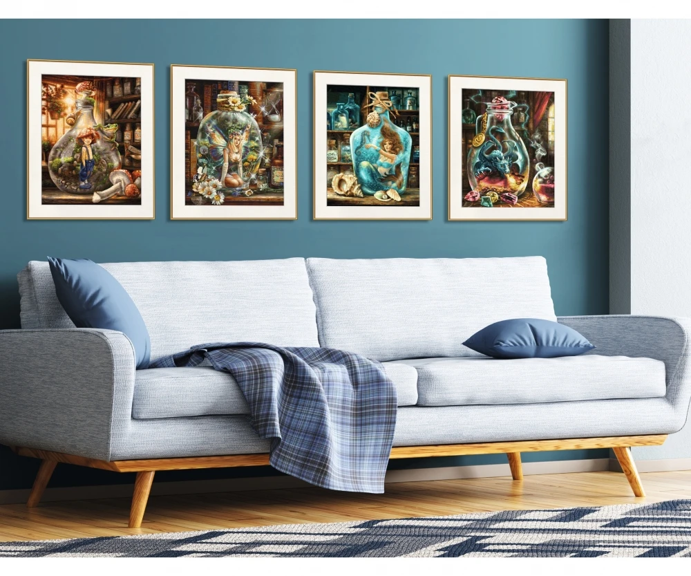 Zeemeerminnen zijn mystieke wezens uit de wereld van de sagen en sprookjes, die magische krachten hebben. In de zee leven veel fantastische en fascinerende schepsels. Tot die wezens uit de zee behoren ook de zeemeerminnen. Half vis, half mens, kunnen zij zonder problemen onder water ademen en hun schubben weerkaatsen het licht met een zachte glans. Zij staan ook bekend om hun schoonheid en de verleidelijke manier waarop zij mannen betoveren. De kleurstelling onderstreept het magische van de situatie en leidt de hobbyschilder de fascinerende wereld van de fabelwezens binnen.
