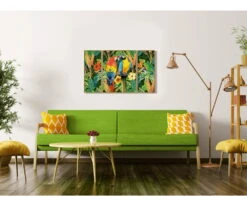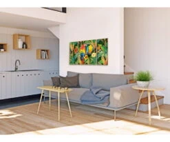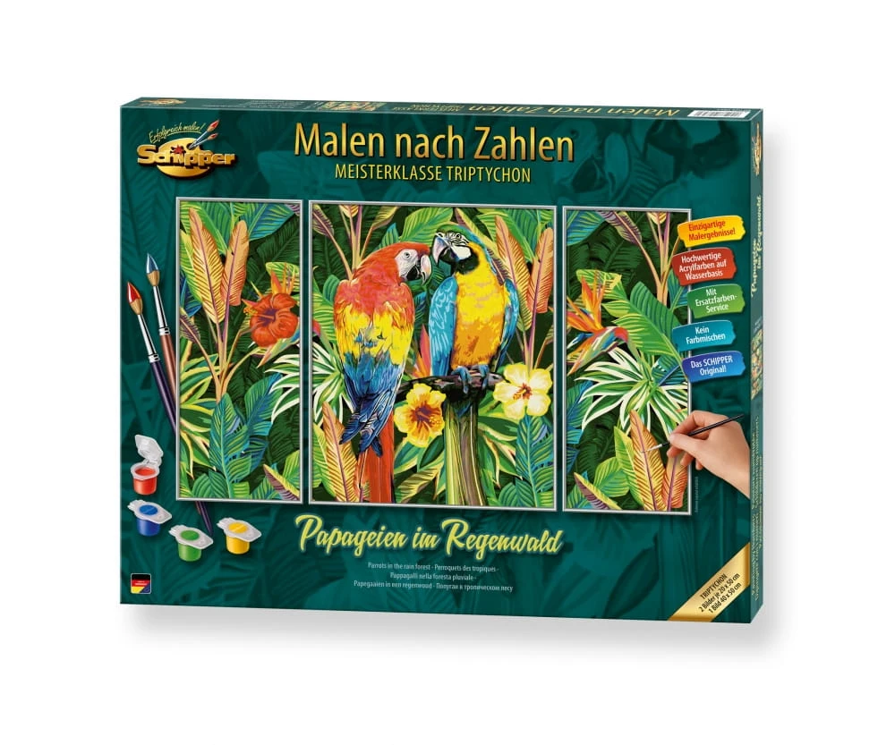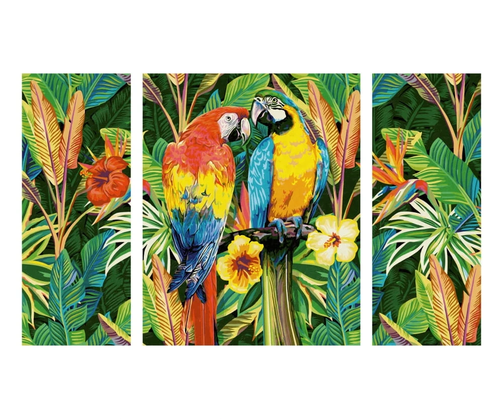 Sie stehen im Mittelpunkt des Triptychons, das den Betrachter durch seine kräftigen Farben und die realistische Darstellung der Papageien verzaubert. Der Hobbymaler findet hier ein farbenfrohes Naturerlebnis.
