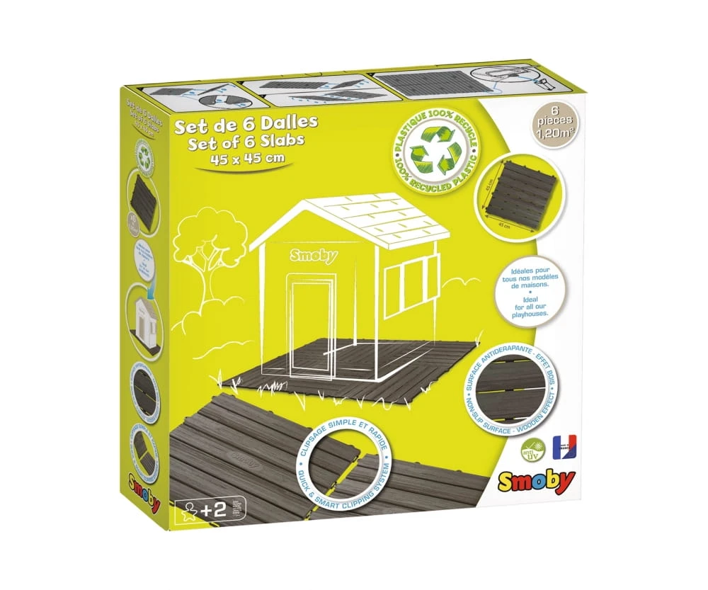 Tolles Bodenplatten-Set von Smoby, mit dem sich blitzschnell ein Boden für ein Spielhaus zusammenbauen lässt. Ein Set besteht aus sechs Fliesen, die sich ganz leicht per Klicksystem zusammenstecken lassen.
