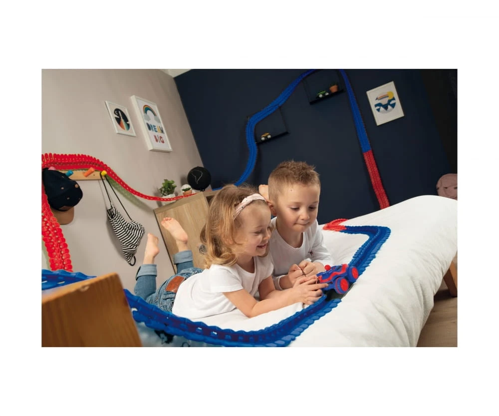 Das Spidey FleXtreme-Set ist das ideale Rüstzeug für den Bau einer rasanten Smoby FleXtreme-Strecke durch das Kinderzimmer: Es besteht aus 184 Schienen-Teilen, einem Spidey Rennauto sowie einem exklusiven Befestigungsclip mit Spinnennetz! Die bunten Schienenteile lassen sich kinderleicht zu einer 4,40 m langen Rennstrecke zusammenstecken und sind sehr flexibel, so dass sie kreativ durch das Kinderzimmer gebaut oder gehängt werden können: über Stühle, das Bett oder den Schreibtisch. Dabei ermöglicht die Multi-Grip Fixierklemme mit Schienen-Supporter eine noch ausgefallenere Rennbahn-Architektur. Denn der Supporter sorgt für noch mehr Kurvenkontrolle und verhindert ein Aushaken des Racing Cars durch zu steile Krümmungen. Das Fixiersystem ist bereits von kleineren Kindern leicht zu verstehen und ermöglicht eine Befestigung an einer Vielzahl von Schikanen, vom Regal über Vorhänge, alles lässt sich in die Strecke einbauen. So entstehen sensationelle Steigungen, über-Kopf-Fahrten und die verrücktesten Abhänge. Das Racing Car wird von Superheld Spidey gesteuert – dank seines speziellen Antriebs kann sich das Auto nicht überschlagen und sogar kopfüber fahren. Gestartet wird via Start-/Stopp-Schalter an der Rückseite und die Front- und Rückbeleuchtung machen auch spannende Fahrten im abgedunkelten Zimmer möglich.
