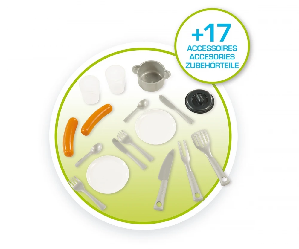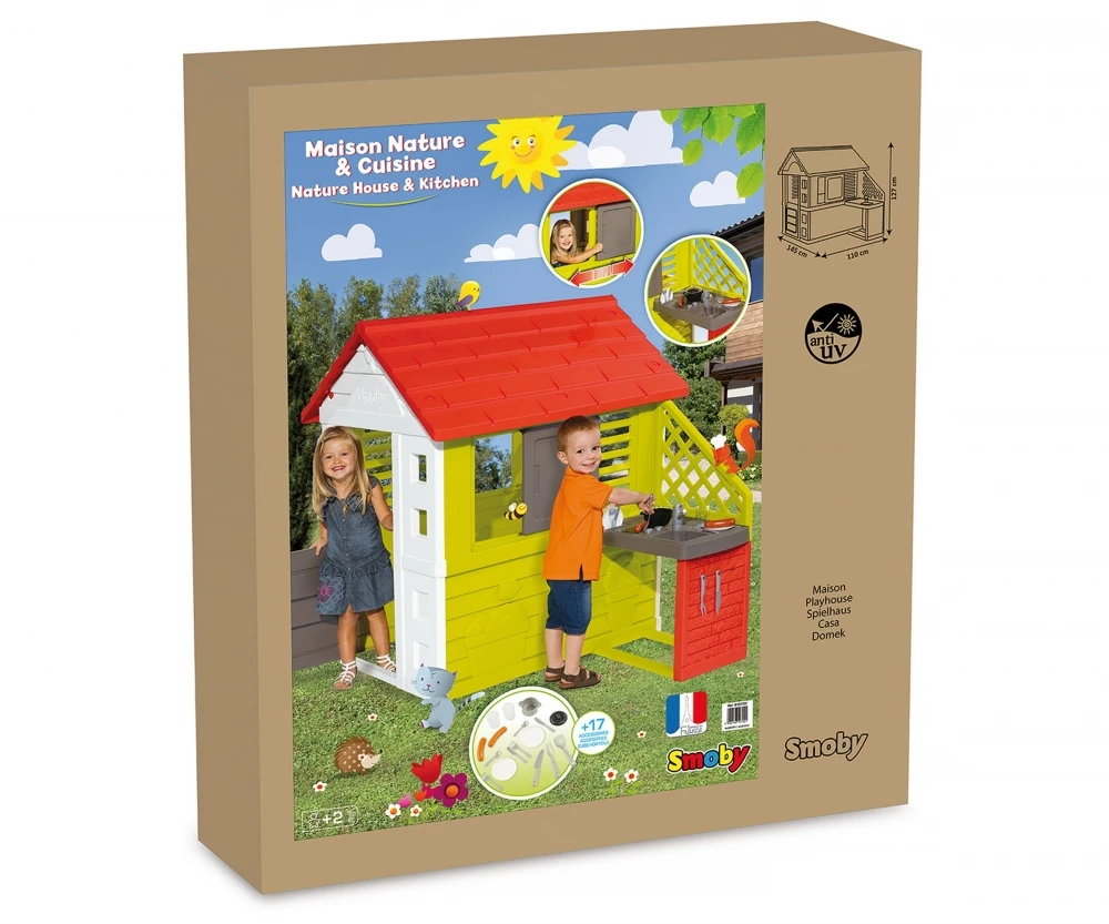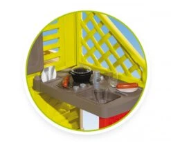 Das stabile Smoby Natur Haus bietet mit seiner tollen Sommerküche viel Spielspaß für die Kleinen. Die an der Außenwand befestigte Spielküche verfügt über eine Spüle mit Wasserhahn (nicht funktionsfähig), eine Barbecue-Grillplatte sowie eine Geschirrablage. Vervollständigt wird das Koch-Erlebnis durch 2 Gläser, 2 Teller, Küchenhelfer, Würstchen und einen Topf.