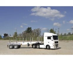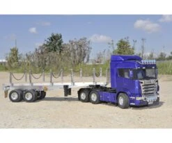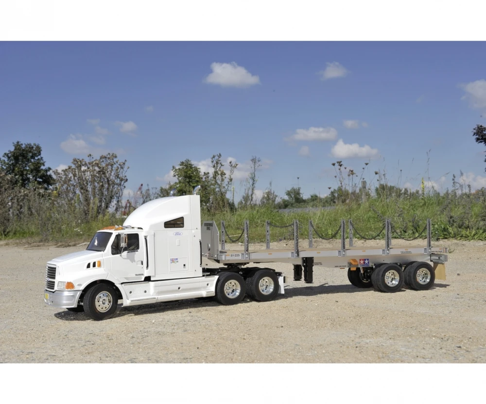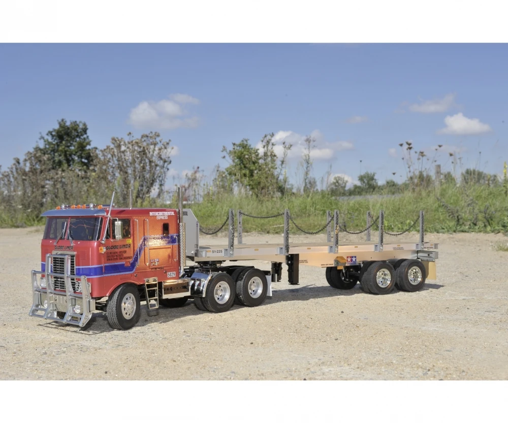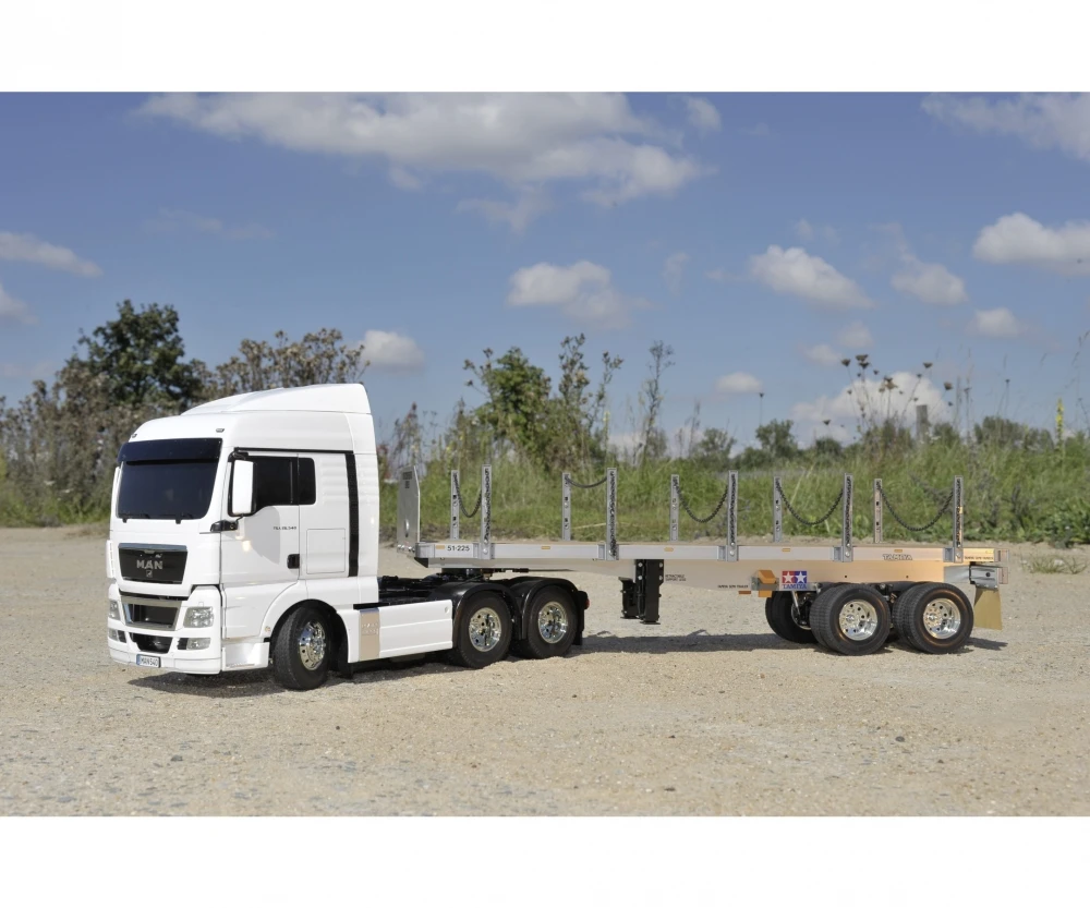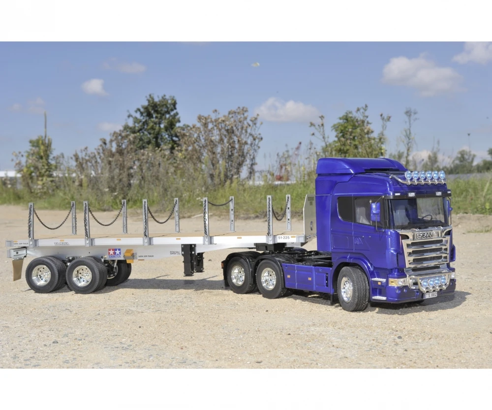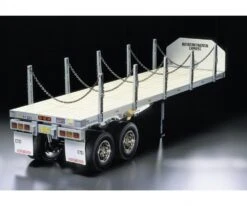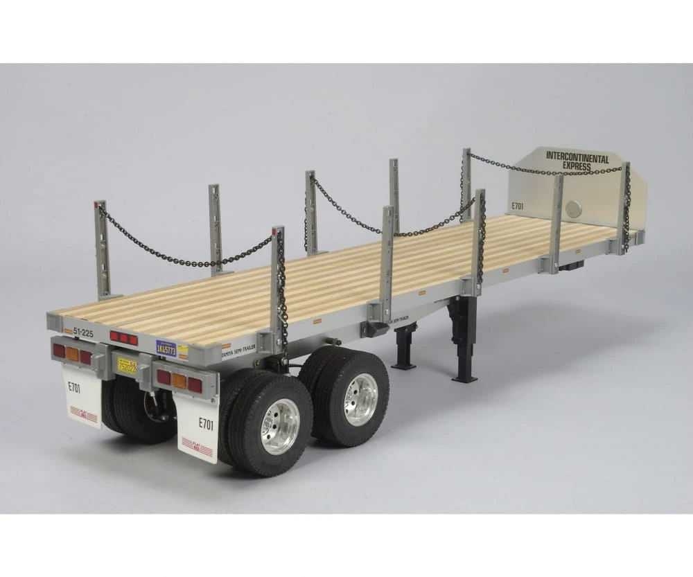 TAMIYA bietet das Modell eines Flachbett-Aufliegers an, der an RC-Sattelschlepper im Maßstab 1:14,5 angekuppelt werden kann. Die Verwendung von Aluminium für den Rahmen und das Fahrgestell sowie sie Verwendung von einer Holz-Auflagefläche verleihen dem Modell extreme Detailgetreue.
