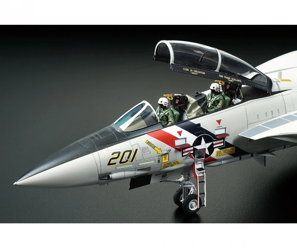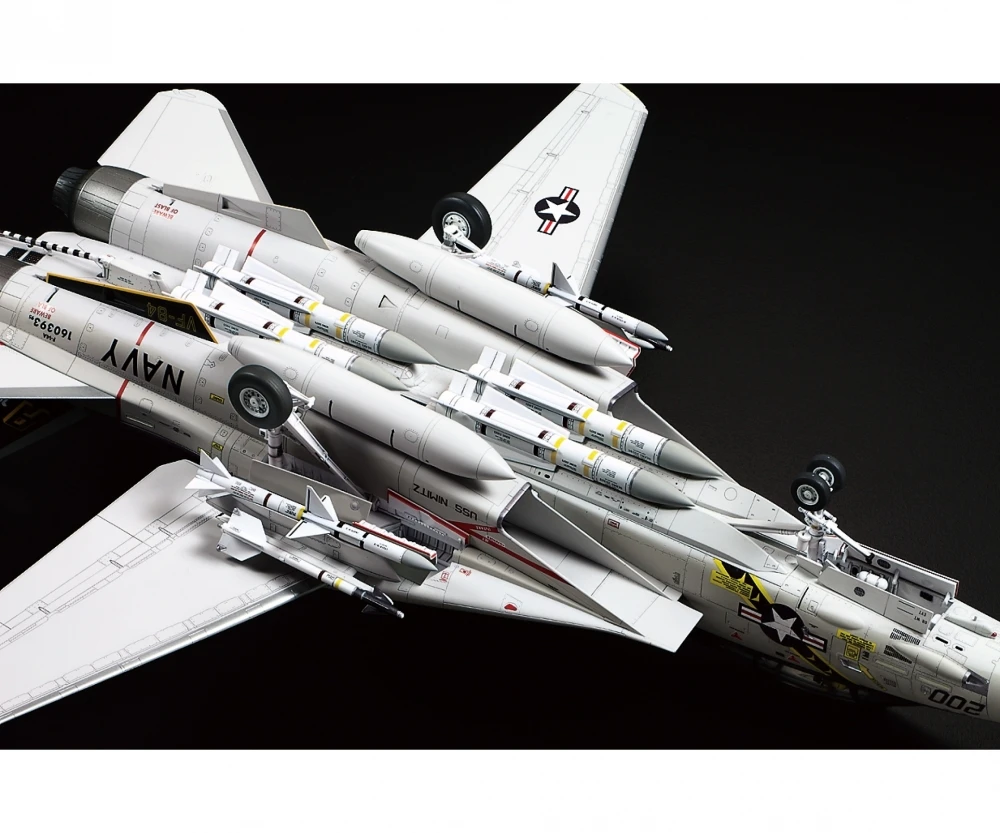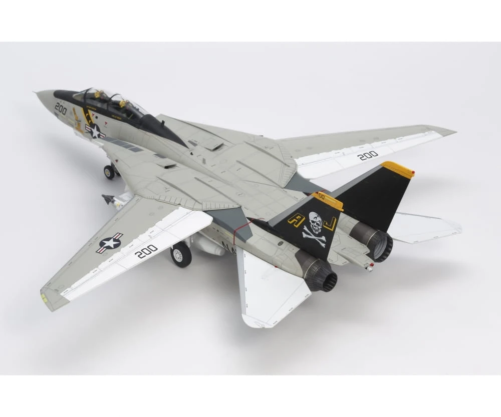 Die Grumman F-14A Tomcat der amerikanischen Marine genießt seit der Außerdienststellung 2006 immer noch großes Interesse in der Öffentlichkeit. Der Erstflug der F-14 war im Dezember 1970 und die Produktion startete 1974 und endete 1992. Angetrieben von zwei TF30 Triebwerken erreichte diese mit dem Nachbrennerschub eine Höchstgeschwindigkeit von ca. Mach 2,3. Die komplexe Bedienung erforderte einen zweiten Mann, den RIO (Radar Intercept Officer) im Cockpit, daher die Auslegung als Zweisitzer. Das vielleicht auffälligste Detail sind die Schwenkflügel, welche von 20° bis 75° geschwenkt werden können (20° für Start- und Landungen, 55° für den jeweiligen Einsatz, 68° Überschallflug, 75° Parkposition (Hangar/Flugzeugträgerdeck)). Die Schwenkflügel erlaubten situationsbedingte Geschwindigkeiten von Lande – bis Höchstgeschwindigkeit. Die Aufnahme und der Einsatz der verschiedenen Waffensysteme machten die F-14 zu einen vielseitigen Trägersystem und erfolgreichen Abfangjäger.